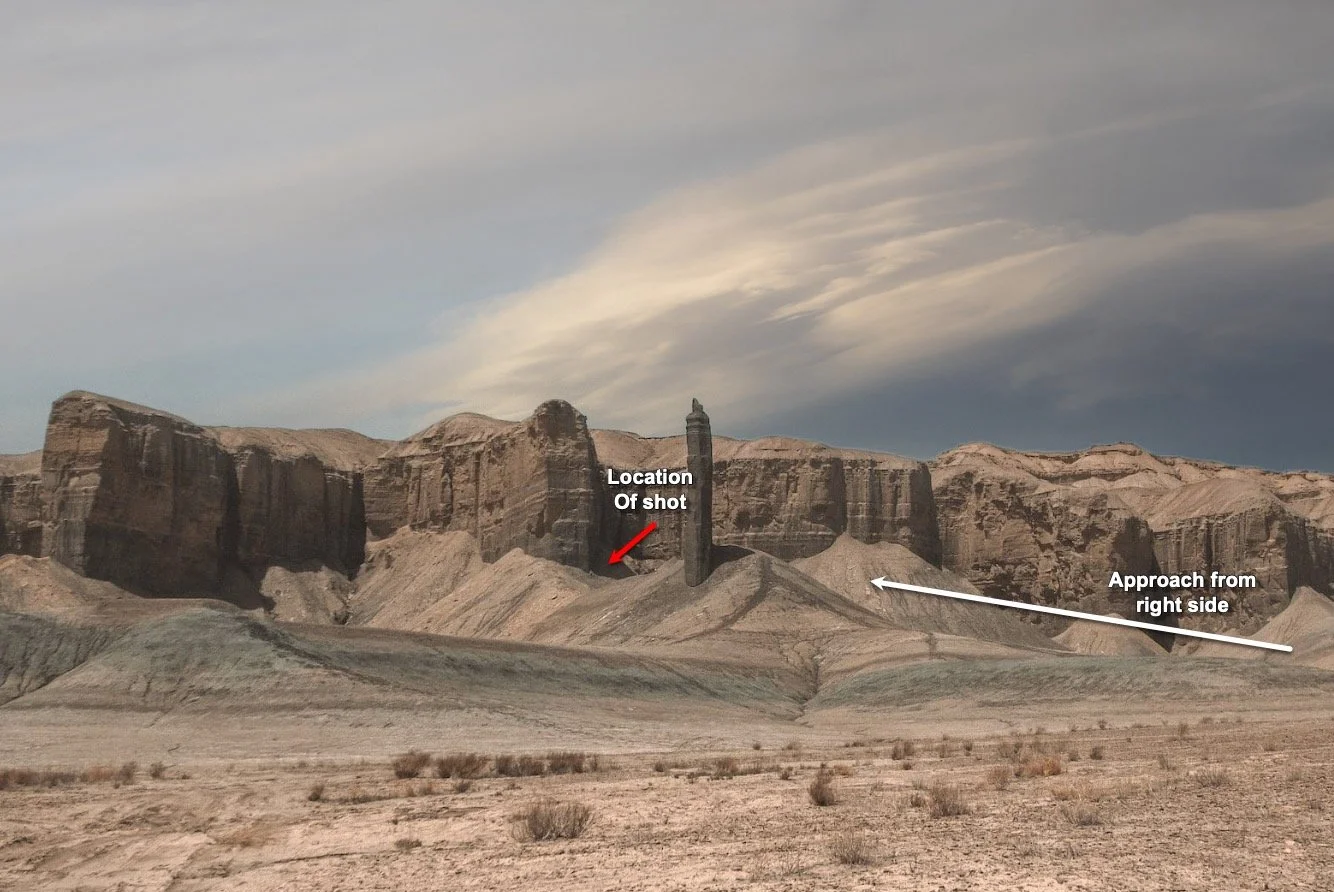 This shot is located on the north (right) side of the mound surrounding the second Spire. It would help if you hiked up the steep dirt mount to get as close to the top as possible.