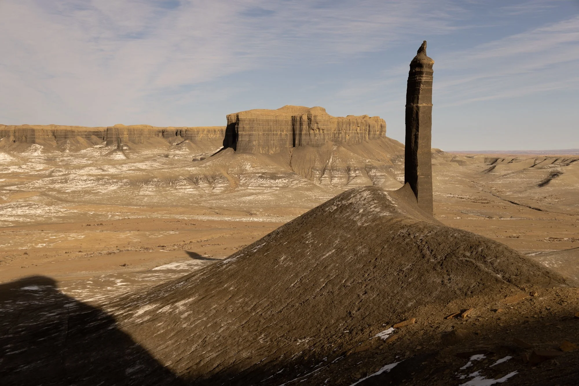 The area around the Factory Butte is badlands, with the closest towns being Hanksville and Caineville, Utah. There is a small camping area just off of the road to this location (not sure if it is sanctioned by BLM or not) with a makeshift fire pit. There are other camping areas and lodgings in both Hanksville and Caineville. There are 2 motels and 2 RV Parks in Hanksville and 1 hotel in Caineville.