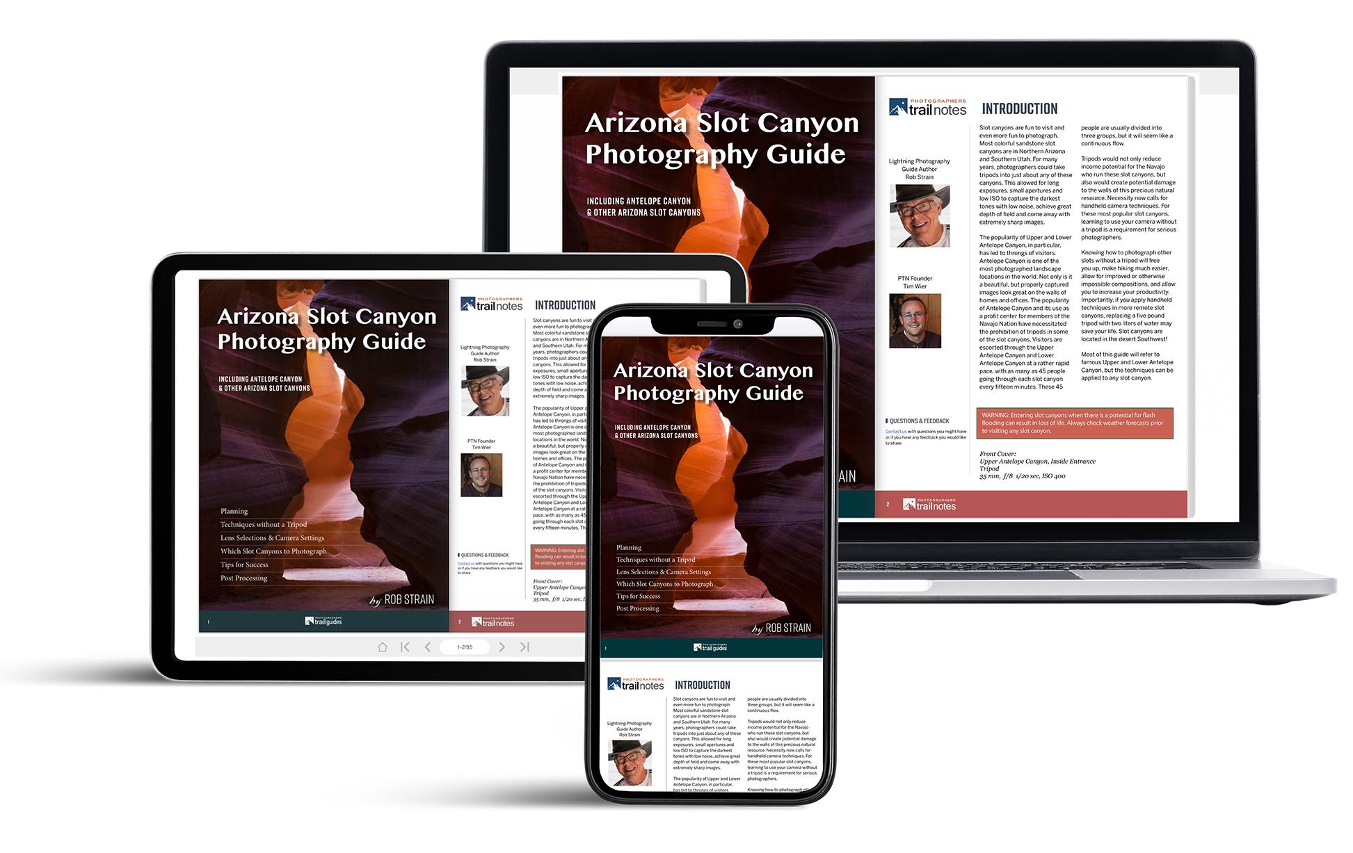 As of July 2018 Upper Antelope Canyon no longer offers photo tours and will not allow tripods in the canyons! Techniques for creating great images in the canyons without a tripod are covered in the Rob Strain - Slot Canyon Guidebook. Slot canyon locations where tripods are permitted are also included the guidebook.