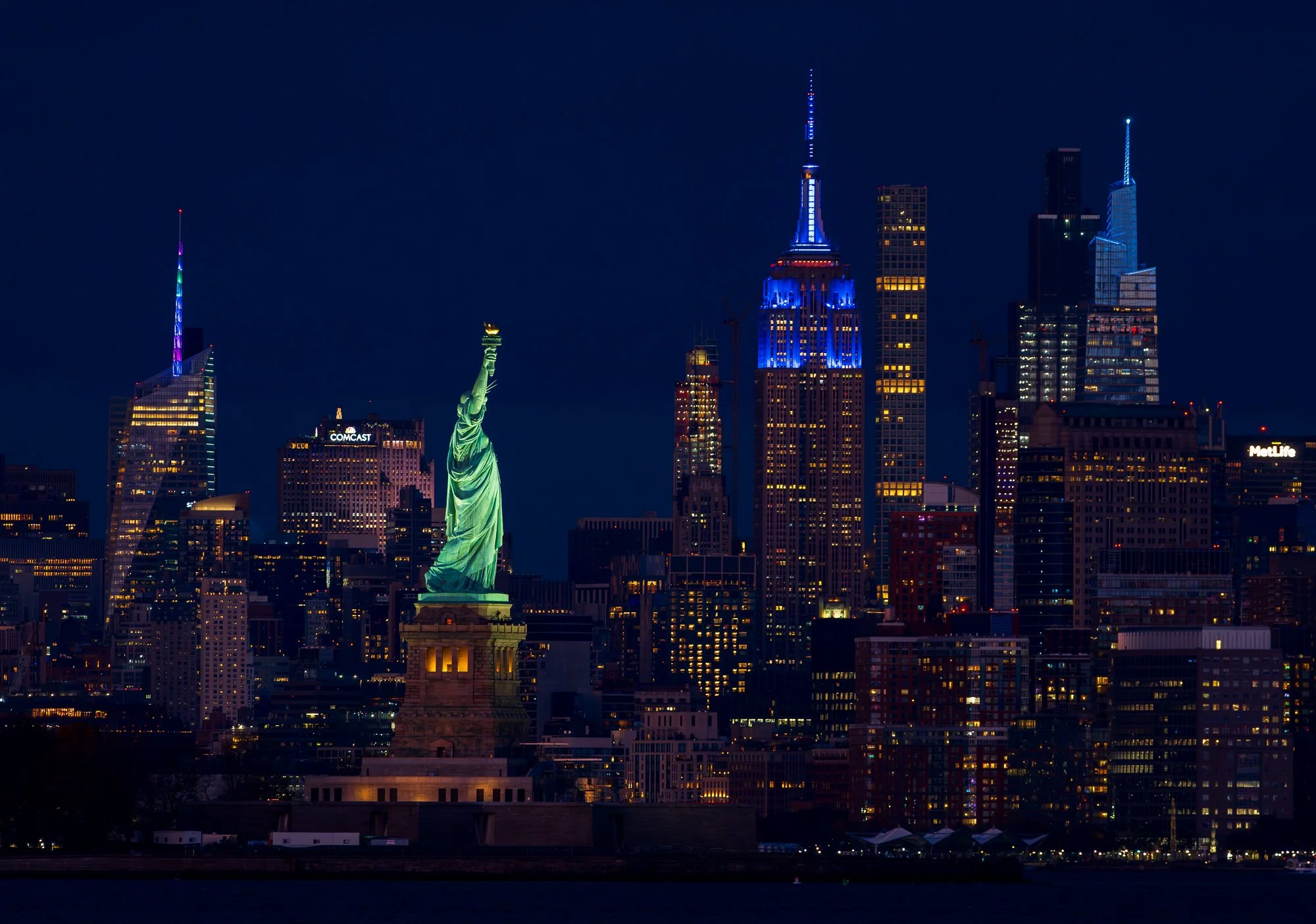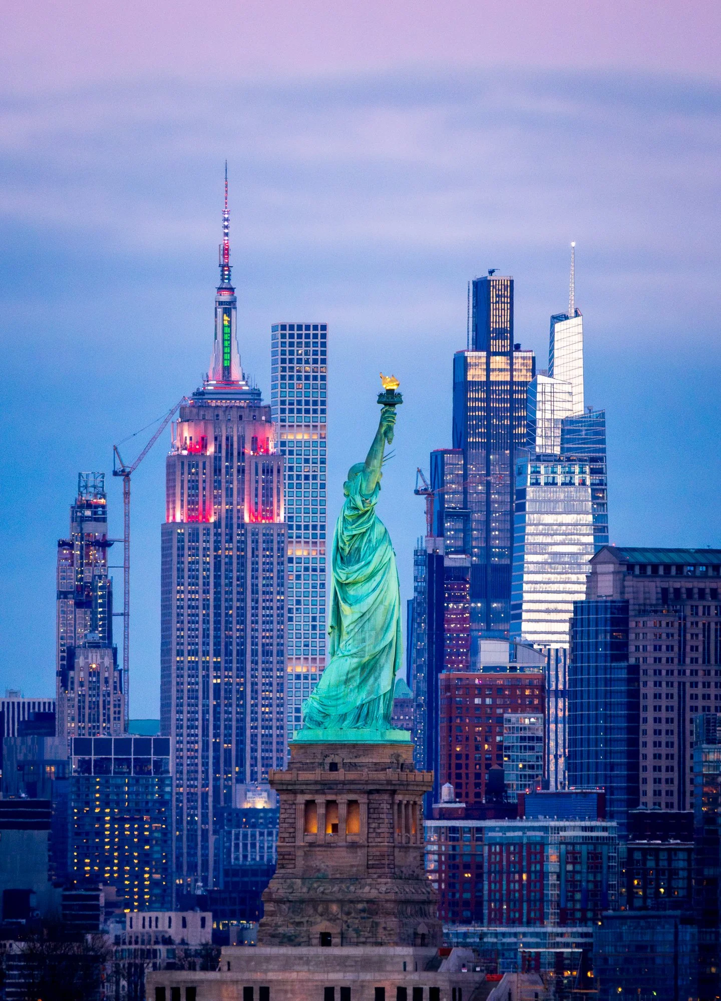 Capturing the Statue of Liberty during sunrise or sunset is ideal, as these times offer beautiful lighting. You want to see the statue illuminated—either by the warm rays of the golden hour or by the artificial lights that highlight its green patina, illuminate the torch's 24K gold flame, and create a warm orange glow on the pedestal. These colors provide a striking contrast to the modern steel and glass skyline in the background.